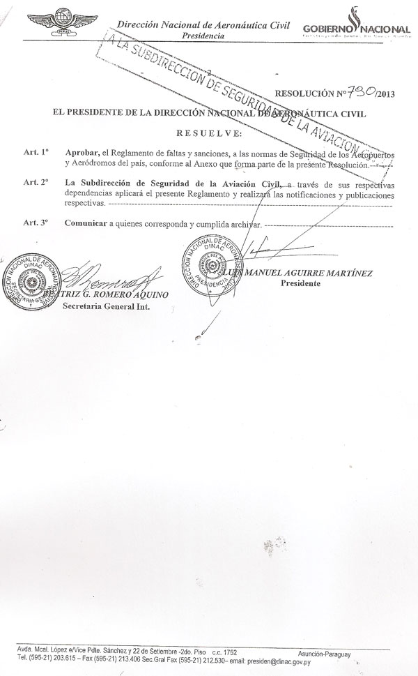 Por la que se aprueba el reglamento de faltas y sanciones a las Normas de Seguridad de los Aeropuertos y Aeródromos del País.